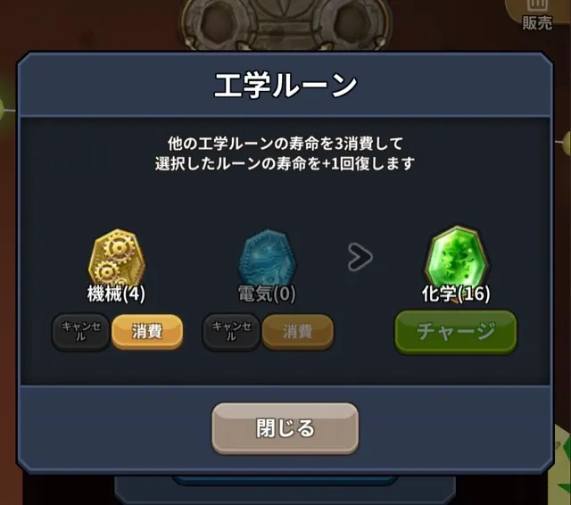 - 同じ種類のルーン寿命3を消費して、指定したルーンの寿命を1回復できます。