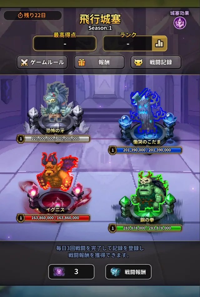 ワールドマップの [飛行城塞] アイコンをタップして入場し、[戦闘記録券] を使用して記録を残すことができます。