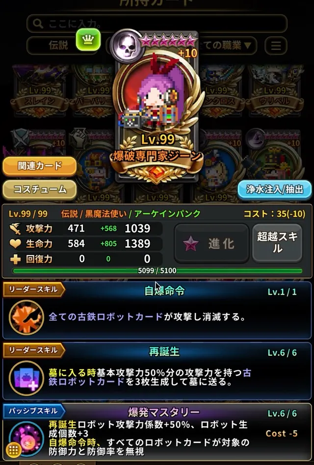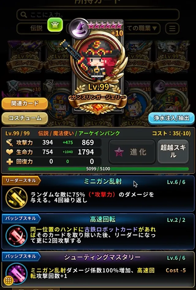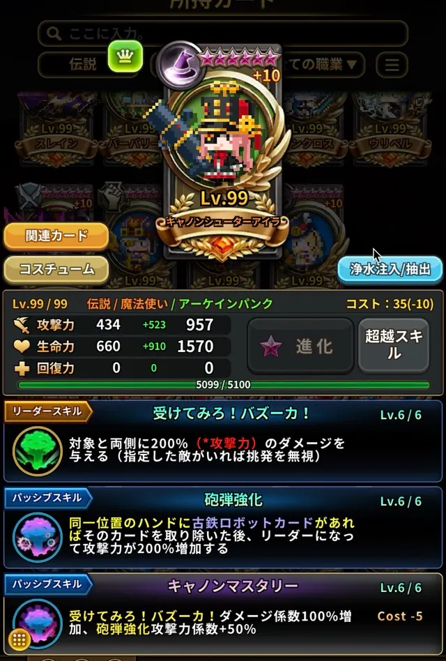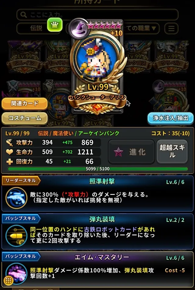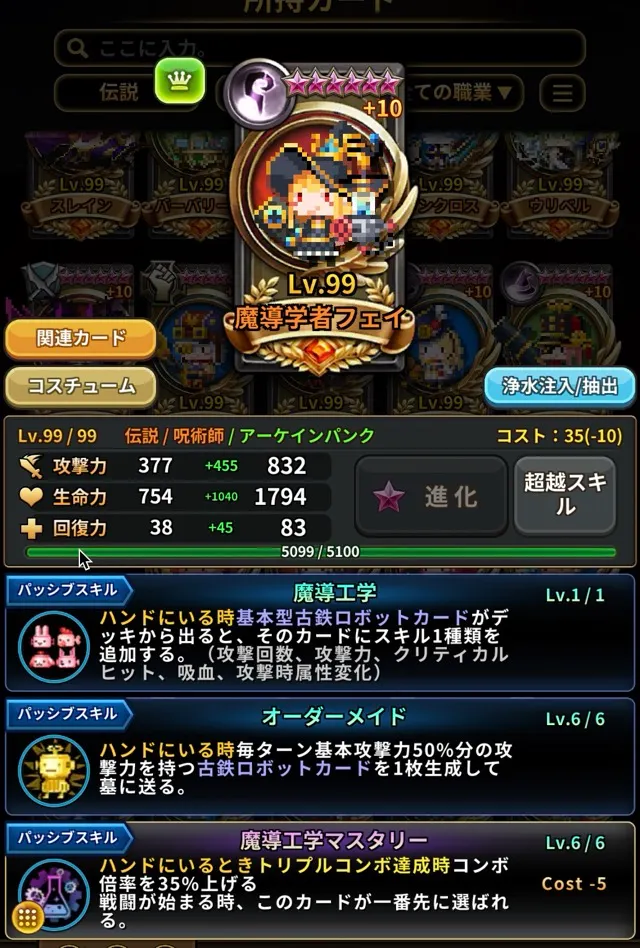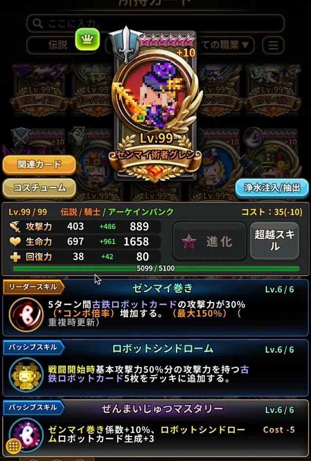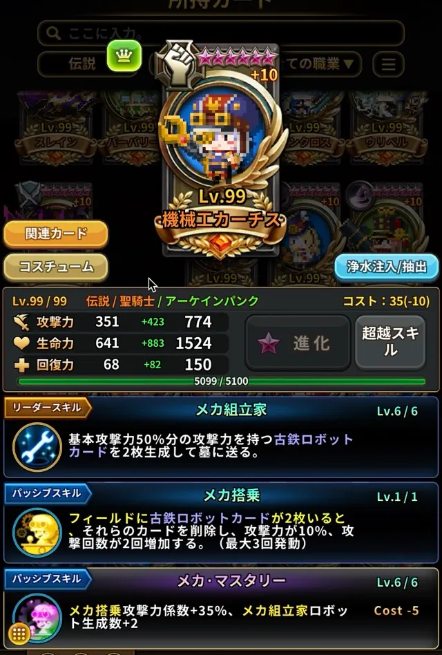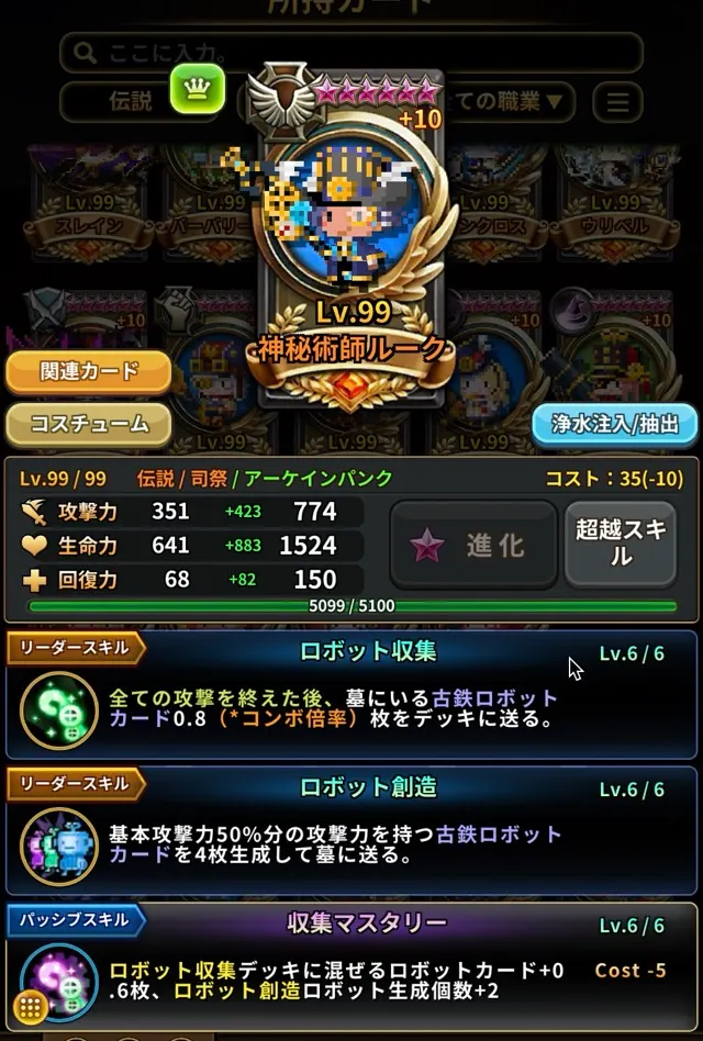 これらのスクリーンショットは、カードが重複+10、超越6星、超越レベル99、専用超越スキルを取得した状態でカード図鑑 > 所持カードセクションから撮影されています。